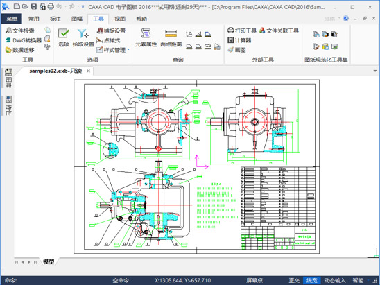提供对话框计算、EXB浏览器、文件检索、DWG转换器等工具,并支持二次开发和扩展,满足专业应用和需求;提供文件比较功能,可对图纸的图幅、标题栏、明细表、几何位置、大小、尺寸值等进行比较,不同部分和相同部分按颜色区分出来,提高审图效率。支持文件打包,可将图纸和其中所用到的文件打包为一个zip文件。增加图纸规范化工具集,用于将图纸快速规范化。