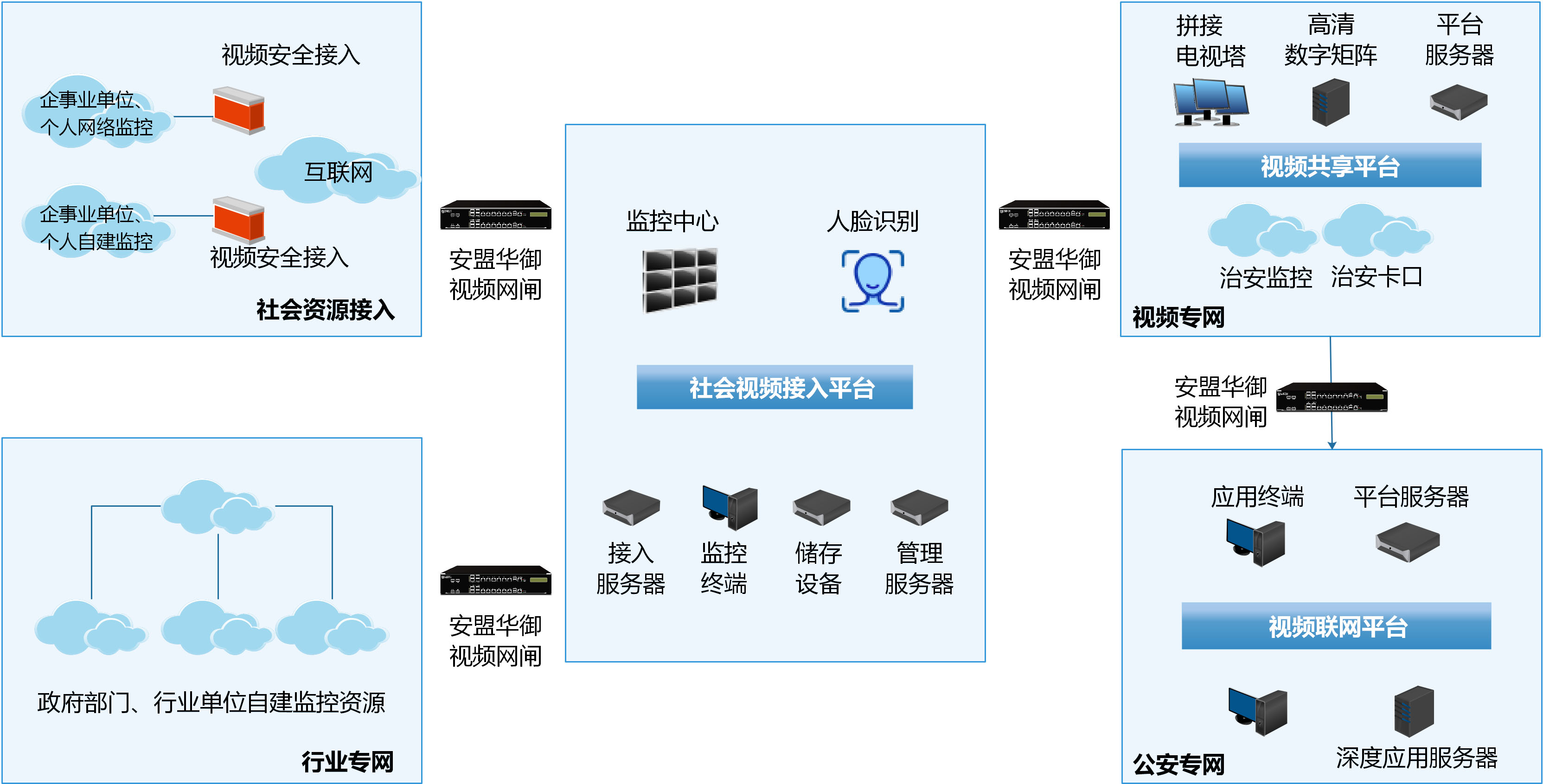 网闸部署与视频专网和公安专网之间,通过平台级联策略允许公安专网调取视频专网中视频平台的数据。