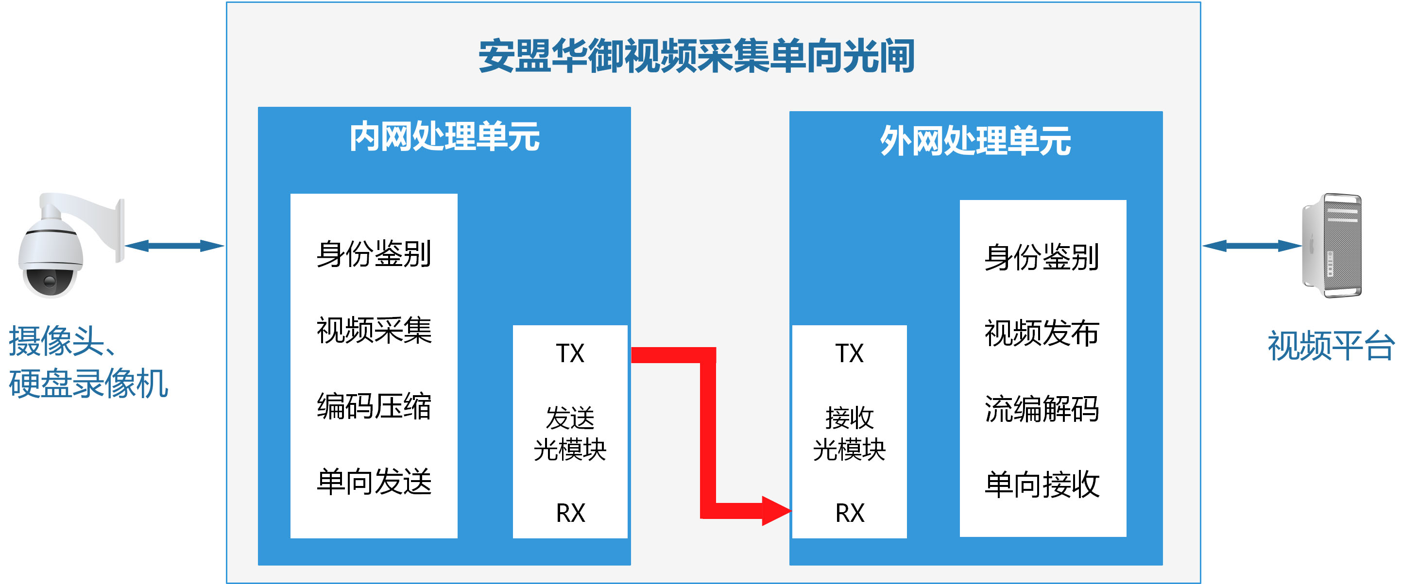 利用发光和收光光器件的物理特性,安盟华御传统单向光闸产品实现了网间数据的物理单向上传。同时,基于多年视频网闸研发的技术积累,安盟信息公司将主动采集和实时发布视频数据流的功能集成到传统的单向光闸产品中,推出了安盟华御视频采集单向光闸。