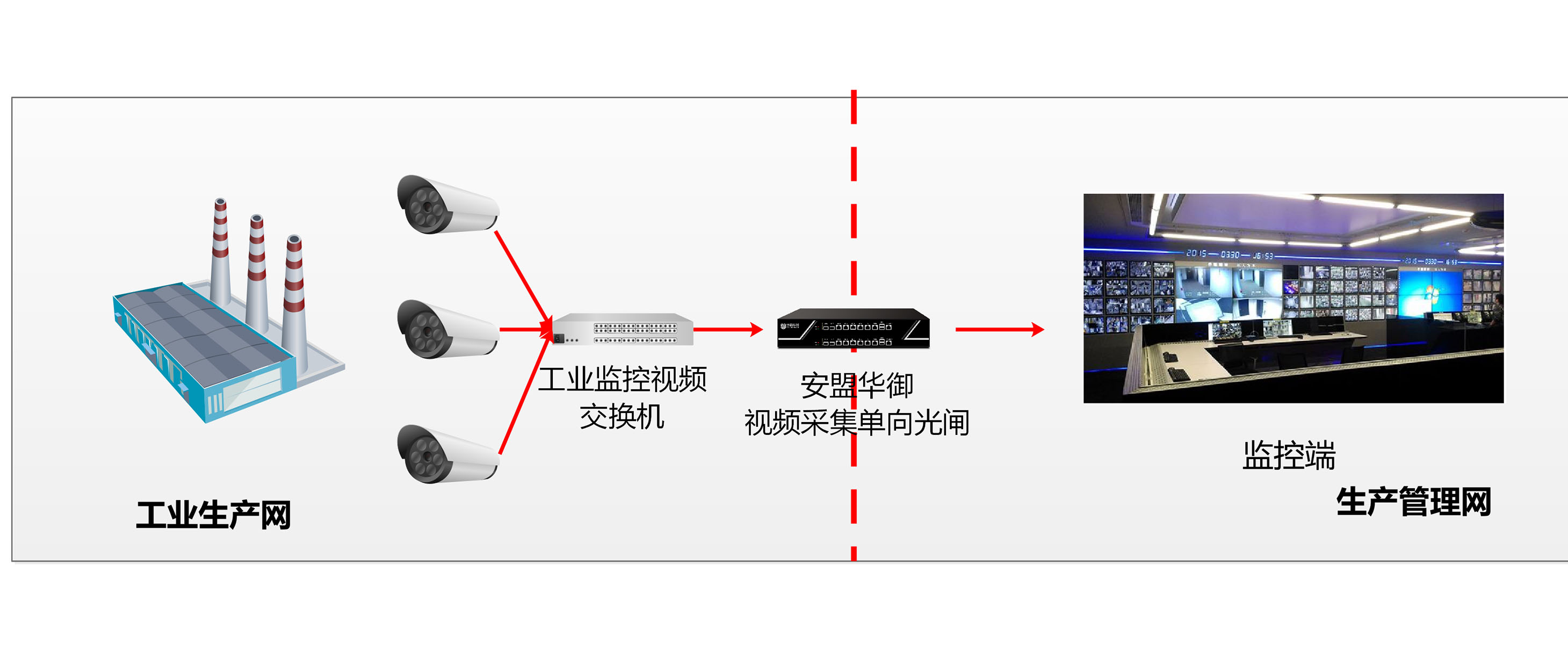 视频摄像头直接接入生产网,或视频网与生产网通过一根线路与办公信息网互联,在生产型企业非常常见。为了保证生产网安全,需要禁止来自办公信息网的任何指令,同时办公信息网能够收集到摄像头的监控视频数据流,推荐部署安盟华御视频采集单向光闸。