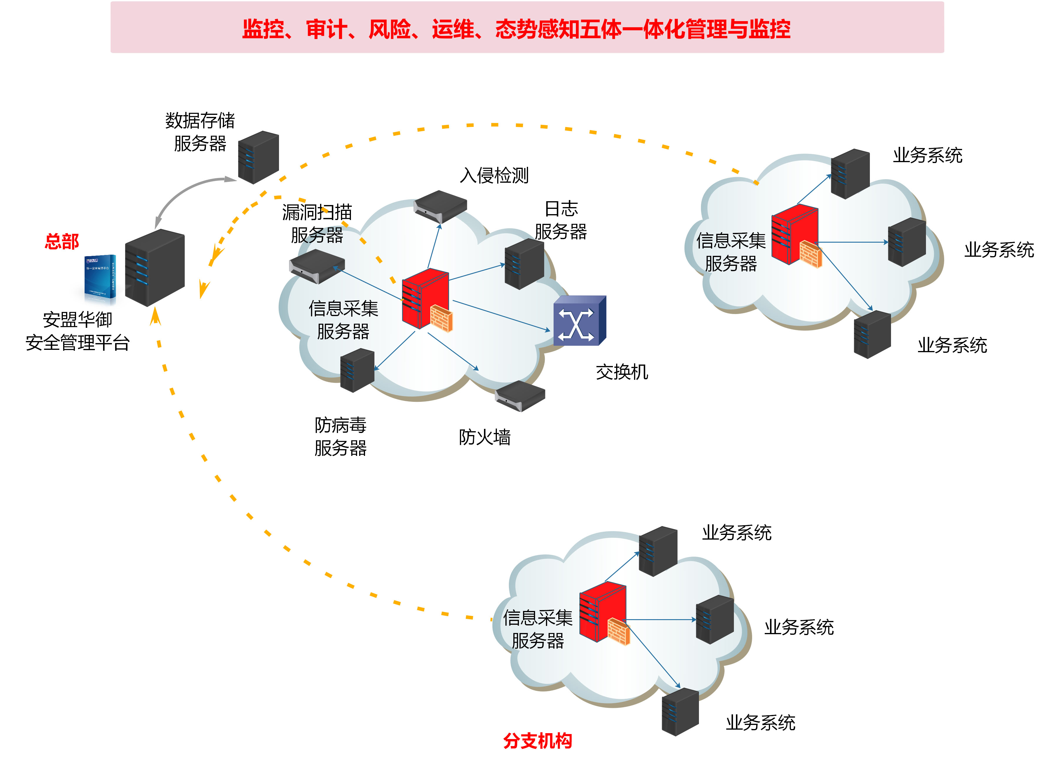 安盟华御安全管理平台以信息资产为基础,以客户的业务信息系统为核心,以用户体验为指引,从监控、审计、风险、运维、态势感知五个维度建立一套全网业务支撑平台,使得各种用户能够对业务信息系统实现可用性、性能及服务水平的监测,结合内外部威胁情报信息的事件、流、漏洞及安全配置分析、审计、预警与响应,风险及态势的度量与评估,以及标准化、例行化、常态化的安全流程管控,通过面向业务的主动化、智能化安全管理,最终实现业务信息系统的持续安全运营。