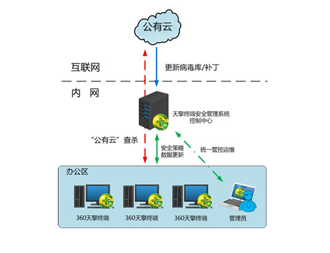 在网络内部部署天擎控制中心和终端,天擎终端通过控制中心连接到360的升级服务器进行升级、更新等,控制中心具有缓存功能,同样的数据文件只会下载一次,可以大幅节省企业总出口宽带。天擎终端根据控制中心制定的安全策略,进行体检、杀毒和修复漏洞等安全操作。进行杀毒扫描时,天擎终端可以直接连接360的云查杀系统,进行云查杀。