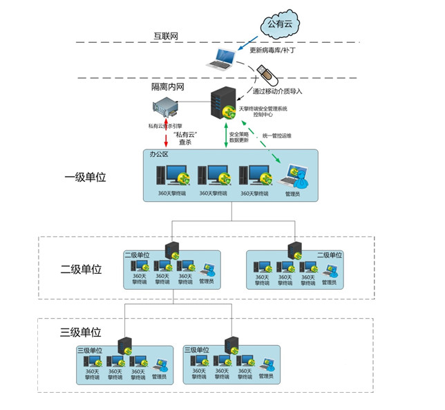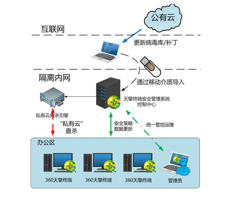 使用隔离网工具,定期从360相关的服务器下载病毒库、木马库、漏洞补丁文件等,更新到总控制中心,各分控制中心会从总控制中心下载需要的升级文件和补丁文件,各区域的终端会从本区域的控制中心进行升级和下载补丁文件修复漏洞。
