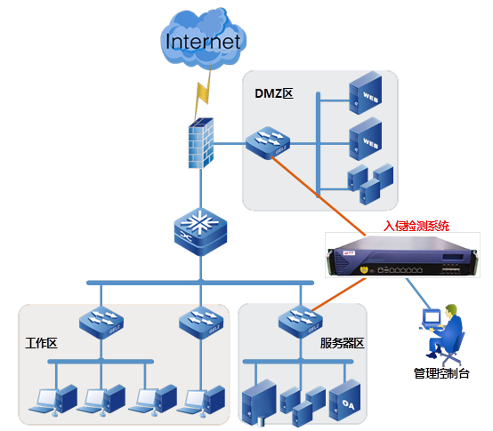入侵检测系统产品探测器通常部署在网络关键链路 (外网出口链路、主要服务器群访问链路、其他关键链路)的旁路位置,对网络流量进行实时采集并进行深度分析,将发现的攻击或威胁进行记录并实时报警,用户可以随时对用户网络目前正在发生或是可能构成潜在威胁的安全事件进行调用查看、分析和确认。