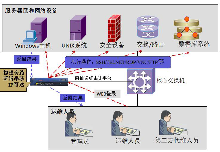 采用物理旁路,逻辑串联的方式接入用户网络,不影响原有网络拓扑;通过统一的身份授权管控,和运维过程的完整审计,并提供历史运维过程真实回放,为企业规范了运维操作的流程,控制人为风险,提高IT系统整体可用性。