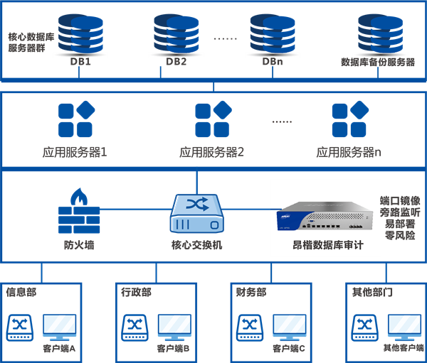通过在核心交换机上设置端口镜像模式或采用TAP分流监听模式,使安全审计引擎能够监听到所有用户通过交换机与数据库进行通讯的全部操作。
