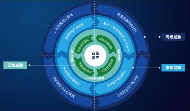 在未知威胁防御层面,需要持续增加信息态势的上下文感知能力,从业务环境视角,不断引入全球范围内多维度的威胁情报数据并结合拟真的业务环境,以人工智能算法深度分析未知威胁的行为,给企业输入持续高频更新的安全能力和对热点威胁的快速响应能力,突破原有安全建设体系的能力边界,从传统防御变为基于情报、环境、智能化行为分析等综合手段,更精准更有效的应对未知威胁。