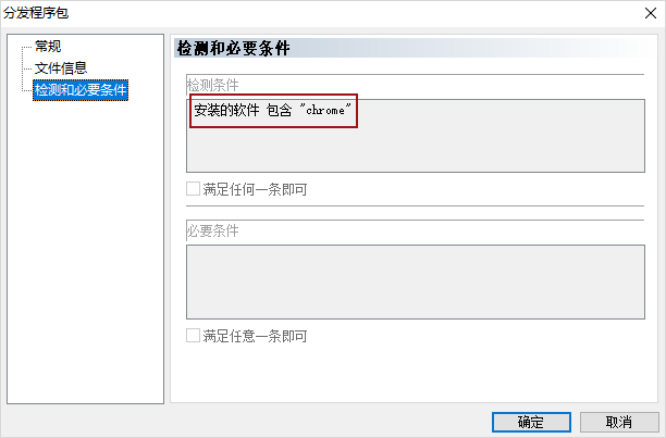 检测条件:是检查软件是否成功安装的标准,客户端会自动检测此条件,如果满足条件则认为软件安装成功,否则会继续尝试安装。