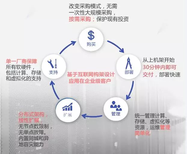 使用计算存储超融合的一体化平台,替代了传统的服务器加集中存储的架构,使得整个架构更清晰简单,通过软件定义的计算资源虚拟化和分布式存储架构实现数据中心无单点故障、无单点瓶颈、弹性扩展、性能线性增长等能力,在满足客户需求的基础上,最大化的提升平台的性能、可靠性、数据安全性和扩展性;