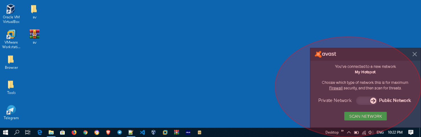 根据Avast的官方介绍,Avast是具有下一代网络攻击防护功能的领先防病毒供应商。 它可以实时阻止异常流量和黑客攻击,并专注于保护用户隐私和信息安全。 Avast具有先进的端到端保护技术。 内置的“防火墙”功能是一种典型的应用程序,可以实时捕获出入用户系统的异常流量。 在默认配置中,当Avast连接到网络时,防火墙将自动给出网络访问提示(Avast Network Notification),如下图所示,它将提示用户,Avast的当前访问网络以及系统是 “我的热点”无线网络。