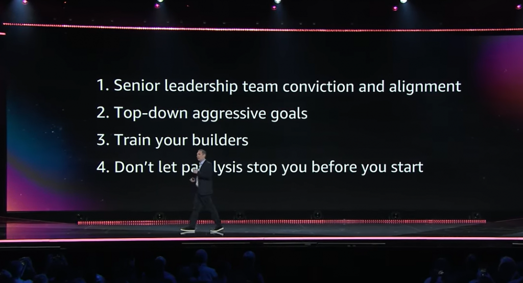 2019年AWS re:Invent大会上AWS CEO 安迪•杰西(Andy Jassy)大谈转型,围绕着云转型,从六个方面做出了阐述:1、领导层协调一致;2、技术的深度和广度;3、架构和应用的现代化;4、规模化使用数据;5、采用机器学习创新;6、突破云迁移的阻碍。