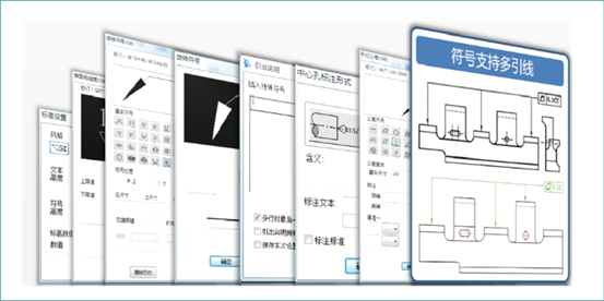 一键智能尺寸标注,自动识别标注对象特征,一个命令完成多种类型的标注;提供符合最新制图标准的多种工程标注功能;尺寸标注时可进行公差和各种符号的查询和输入,相关数值和符号位置都可随图形的变化而自动关联,杜绝人为原因导致的错误。