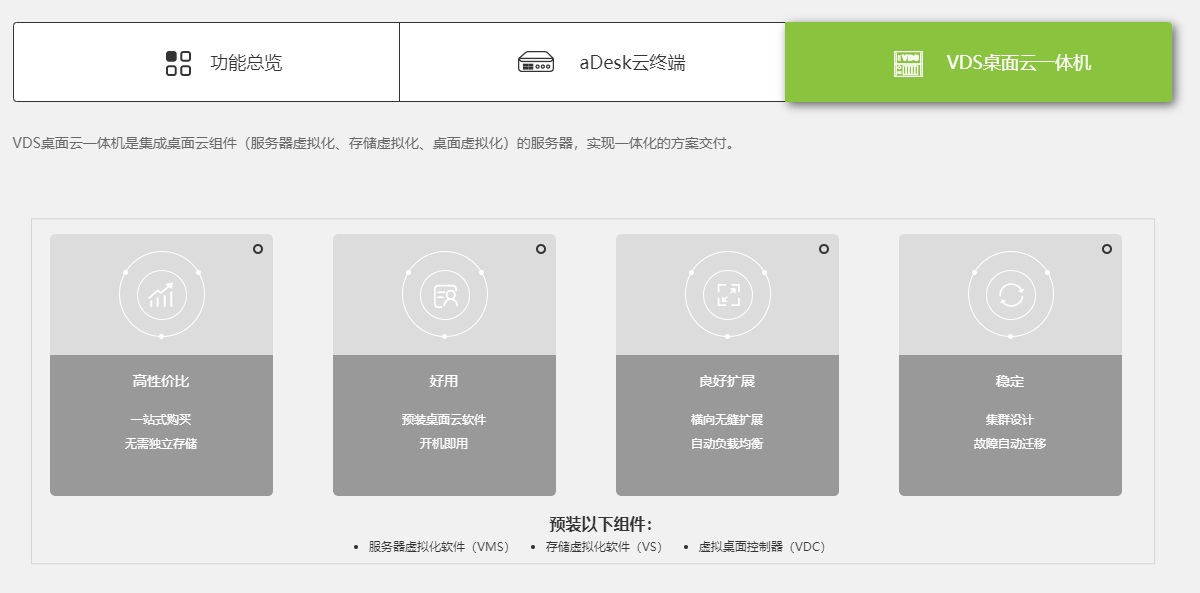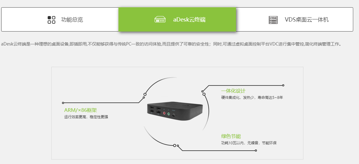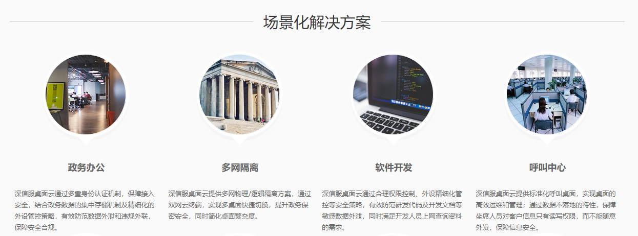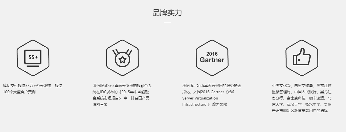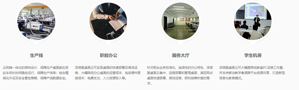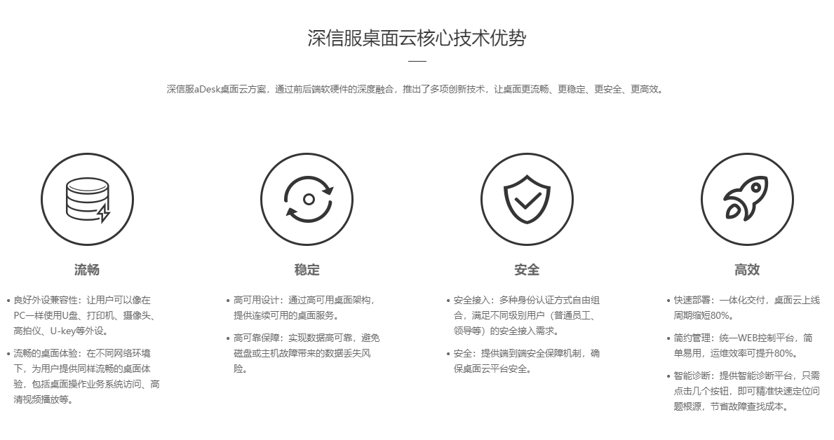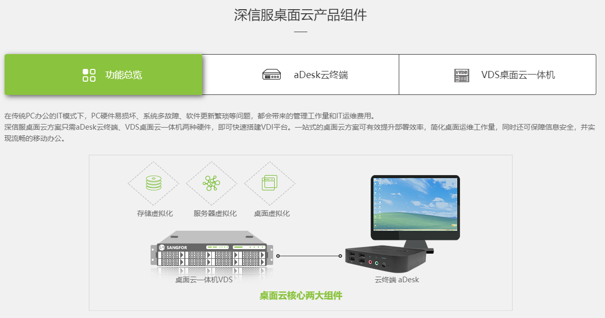 深信服aDesk桌面云方案,是基于融合架构的新型桌面模式,通过深度整合服务器虚拟化、桌面虚拟化及存储虚拟化,只需桌面云一体机和云终端两种设备,即可实现云平台的快速交付,为用户提供操作体验及软硬件兼容性媲美PC,更安全、更高效的云桌面。