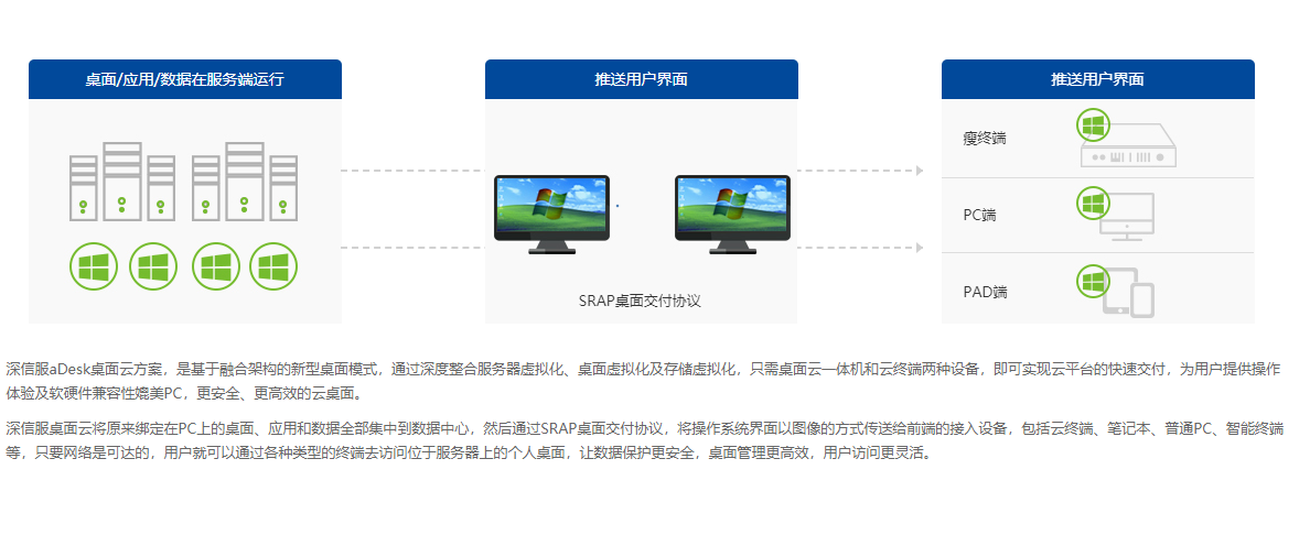 深信服桌面云将原来绑定在PC上的桌面、应用和数据全部集中到数据中心,然后通过SRAP桌面交付协议,将操作系统界面以图像的方式传送给前端的接入设备,包括云终端、笔记本、普通PC、智能终端等,只要网络是可达的,用户就可以通过各种类型的终端去访问位于服务器上的个人桌面,让数据保护更安全,桌面管理更高效,用户访问更灵活。