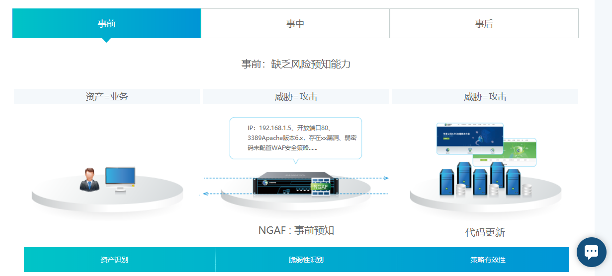 事前:深信服NGAF帮助用户在事前自动发现新增资产、评估漏洞及是否有保护策略。