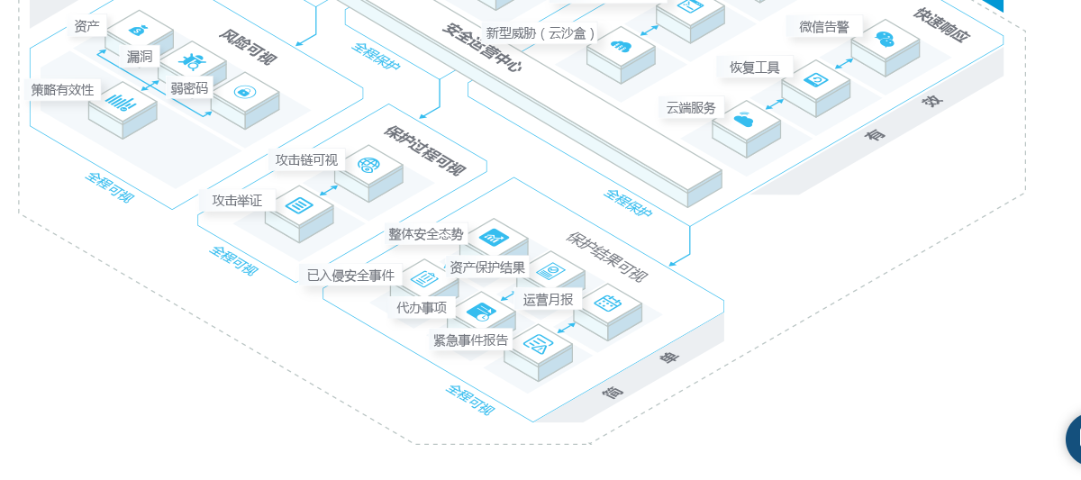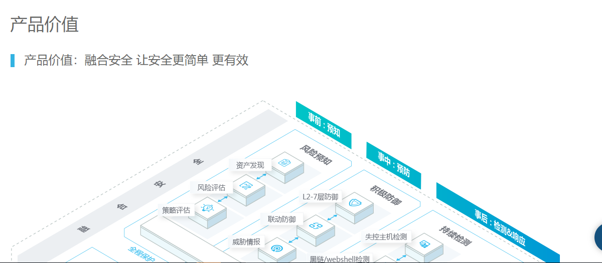 事后:持续检测绕过防御的威胁,并通过云端安全服务提供7*24小时快速响应的技术服务。在IT业务运维全过程内向用户提供对风险的认知、对保护过程的认知和对结果的认知,帮助您的IT系统更简单、更安全、更有价值。