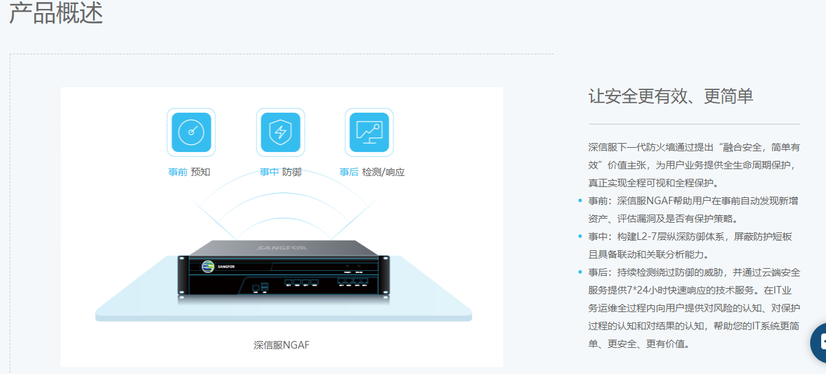 深信服下一代防火墙通过提出“融合安全,简单有效”价值主张,为用户业务提供全生命周期保护,真正实现全程可视和全程保护。