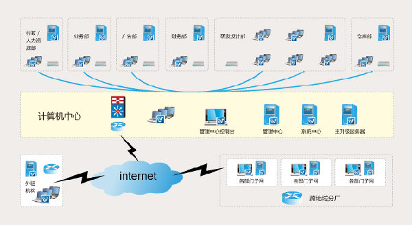 通过对典型制造型企业网络的分析,并结合金山毒霸网络版杀毒软件产品的特性,金山毒霸确定了统一管理,分层多级的部署方式,整体实现安全域。计算机中心是网络的中心管理节点,金山毒霸网络版的管理中心部署在这里,并加设系统中心,主升级服务器。