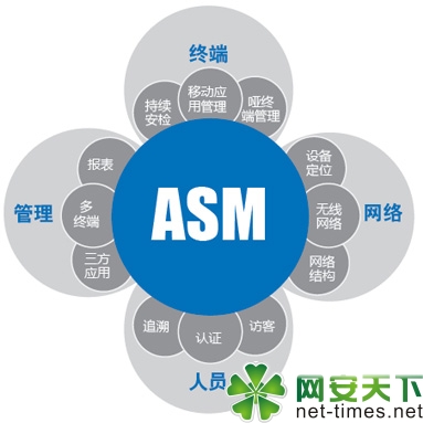 ASM6000系统能够对网络使用、安全管理中的各种元素,采用四个维度进行 管控,包括:终端、网络、人员、管理。