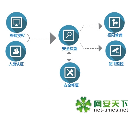 通过四个维度的管控从而实现了终端、网络使用的过程化管理, 包括:网络终端设备和人员的双重授权——终端的安全检查与修复——访问权限的管理——终端的持续安全监控。