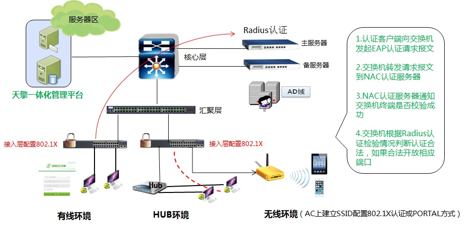 不升级改变网络,不造成单点故障,不影响网络性能,支持企业内部准入控制需求,使内部网络管理变得安全、透明、可控。产品采用旁路部署方式,不造成单点故障,支持单服务器多物理网络认证技术,支持有无客户端的认证,支持有线和无线的认证,兼容国内外大多数常用交换机,支持多种入网认证技术,兼容多种第三方认证源认证,内置Radius认证引擎、安全检查引擎、设备发现引擎,支持集中和分布式部署方式。