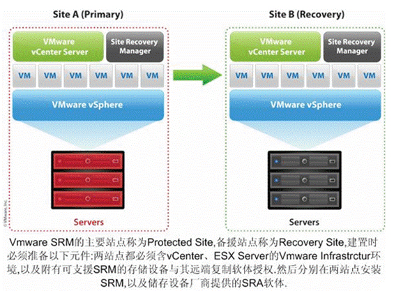 1.服务器虚拟化 VMware vSphere 4:基础架构虚拟化 VMware vCenter Server:图形化的管理中心,策略的制定者和执行者 VMware ESXi(免费试用版本) 2. 桌面虚拟化 VMware View:虚拟桌面 VMware Workstation:在PC上并发运行XP、Visit和Win7 VMware Fusion:(面向 Mac) VMware ThinApp:应用封装和发布工具 VMware ACE:安全桌面 3. VMware vCenter Site Recovery Manager 虚拟化环境下的容灾方案,自动化管理灾难切换、回切。VMware SRM是在VMware Infrastructure架构下,搭配储存端(或闸道器端)远端复制功能的一种灾难备援管理工具。VMware SRM本身是安装在VMware VirtualCenter上的外挂程式,搭配储存厂商提供的Storage Replication Adapter(SRA)软体,便可与底层的储存设备沟通,完成灾难恢复的程序。 在SRM架构中,实际负责复制资料的是底层储存设备的远端复制软体,SRM则是提供一个管理介面与政策设定工具,用于设定两站点的备援关系,以及故障失效切换的执行程序。至于SRA软体同样也是安装在VirtualCenter上,以作为SRM与储存设备间的中介桥梁,如前所述,SRA是由个别的储存厂商提供,每一款储存设备都有专属的SRA软体。 SRM等同于把大量的Script包在一个易于使用的介面裡面,只要先为两端点底层储存设备的磁碟区,设定好镜像复制关系,然后到VMware SRM介面中,设定对应于磁碟区的虚拟机器、灾难恢复程序,以及其他细节参数即可。 当灾难发生时,管理者只要点选SRM介面中的Failover选项,SRM便会通知储存设备的SRA软体,接下来SRA软体便会通知备援站储存设备,将预设镜像複本磁碟指派给备援站上指定的虚拟机器,然后开机启动。 透过VMware SRM架构,在灾难备援上可得到以下好处: ◆ 成本相对较低 SRM本身需要依处理器数量与售后服务等级收费,但储存设备的SRA软体是免费提供。对于迈瑞已购置了储存设备远端复制功能授权,利用SRM建置灾难备援环境需要的开销相对有限。 ◆ 加速恢复与提高恢复的可靠性 通过自动化恢复流程,确保能够满足迈端的恢复时间目标 (RTO)。由于SRM把大量手动程序自动化了,只要设定好备援环境虚拟机器与储存设备的磁碟镜像关系,透过预设的故障失效切换程序,只要用滑鼠点选几个选项,系统就会自动完成灾难恢复动作,在备援站自动启动相对应的虚拟机器,并挂载上对应的磁碟。 比起必须依照厚重还原执行手册,以手动方式逐一执行还原程序的传统作法,在SRM下只要妥当设定好预设程序,接下来几乎能全自动化进行,因此减少了人为操作恢复程序发生错误的可能,进而提高了灾难恢复的可靠性。 ◆ 随时可执行备援站测试验证 过去对于IT管理部门来说,要执行一次备援站的测试演练可是一件大事,必须提前几个月制定演练时程,届时切断主站与备援站间的复制关系,同时还得让各个主要服务的负责人到场监督,并依厚重的执行手册依序实施恢复程序。不但劳师动众,而且也得花费相当长的准备与执行时间,才能验证备援系统能否正常运作。 而在导入VMware SRM架构后,由于备援站已经被虚拟化了,利用单一管理平台就能监管多个服务的运行,加上虚拟平台也提供了虚拟网路功能,因此管理者可随时利用SRM介面上的Test选项,便能按照与正常Failover相同的程序执行备援站的测试演练,而不会影响到主站系统的运作。 SRM示意图: