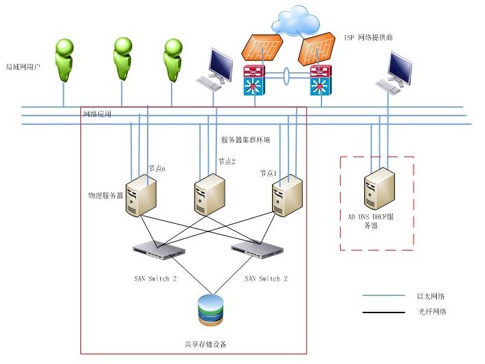 服务器硬件:群集服务器的配置没有特殊要求。最少配置4台服务器。其中两台应用服务器,1台备份服务器,一台单独的域控管理服务器。